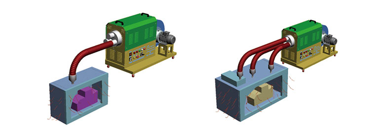 眾所周知,型砂干燥效果的好壞,直接影響到鑄件的質(zhì)量。特別是潮濕陰冷天氣,砂型烘干合箱后等待澆鑄時(shí)間一長,型砂也很容易再次吸潮。傳統(tǒng)的噴燈烘干方法費(fèi)時(shí)費(fèi)力,工效低,砂型澆鑄面干燥效果不理想,加上干燥深度過淺,致使外部水分滲透至澆鑄面過快,加大了鑄件質(zhì)量風(fēng)險(xiǎn)。對結(jié)構(gòu)復(fù)雜或多腔室的砂型扣箱后的烘干,傳統(tǒng)的整體烘干辦法烘干時(shí)間長,能耗大,且澆鑄面干燥程度很難確認(rèn),給鑄件質(zhì)量的把握增加了難度。澆鑄流程一般都是砂芯與砂型先烘干→后配箱→再澆鑄,工序多,時(shí)間長,速度慢,效益低。我公司根據(jù)多年工業(yè)熱風(fēng)機(jī)生產(chǎn)經(jīng)驗(yàn),結(jié)合鑄造行業(yè)的實(shí)際需要研發(fā)的鑄型熱風(fēng)干燥機(jī),較好的解決了鑄造企業(yè)生產(chǎn)中所遇到的這類問題。