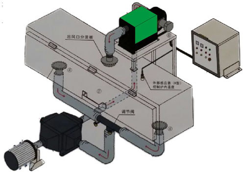 循環(huán)烤箱是用顯數(shù)儀表與溫度傳感器的連接來控制工作室的溫度,采用熱風循環(huán)送風來干燥,熱風循環(huán)系統(tǒng)分為水平送風和垂直送風,均經過專業(yè)設計,風源是由電機運轉帶動送風風輪,使吹出的風吹在電熱管上,形成熱風,將熱風由風道送熱工業(yè)烤箱的工作室,且將使用后的熱風再次吸入風道成為風源再度循環(huán)加熱,大大提高溫度均勻性。如箱門使用中被開關,可借此送風循環(huán)系統(tǒng)迅速恢復操作狀態(tài)溫度值。