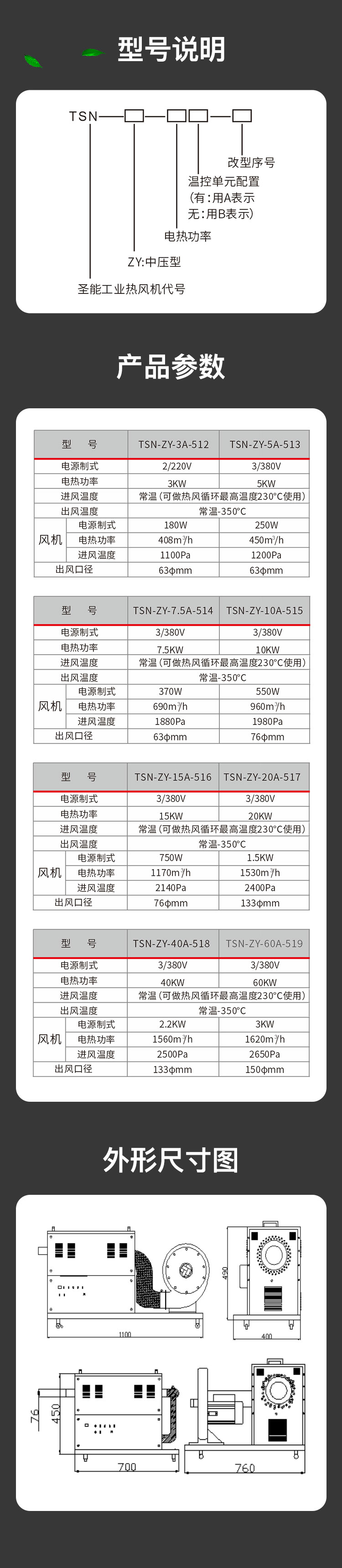 “TSN”工業(yè)熱風(fēng)機(jī)主要由送風(fēng)系統(tǒng)、加熱系統(tǒng)、溫控系統(tǒng)三大部分部分組成。通電后,鼓風(fēng)機(jī)把空氣吹送到加熱器里,令空氣從螺旋狀的電熱絲內(nèi)、外側(cè)均勻通過,電熱絲通電后產(chǎn)生的熱量與通過的冷空氣進(jìn)行熱交換,從而使出風(fēng)口的風(fēng)溫升高。出風(fēng)口處的K型熱電偶及時將探測到的出風(fēng)溫度反饋到溫控儀,儀表根據(jù)設(shè)定的溫度檢測著工作的實(shí)際溫度,并將有關(guān)信息傳遞回固態(tài)繼電器進(jìn)而控制加熱器是否工作。同時,鼓風(fēng)機(jī)可利用風(fēng)量調(diào)節(jié)器(變頻器、手動)調(diào)節(jié)吹送空氣的風(fēng)量大小。另外,送風(fēng)系統(tǒng)及加熱器,均有過載超溫自動保護(hù)裝置,總電路也設(shè)計(jì)了緊急摯,以保證安全,防止錯誤操作。